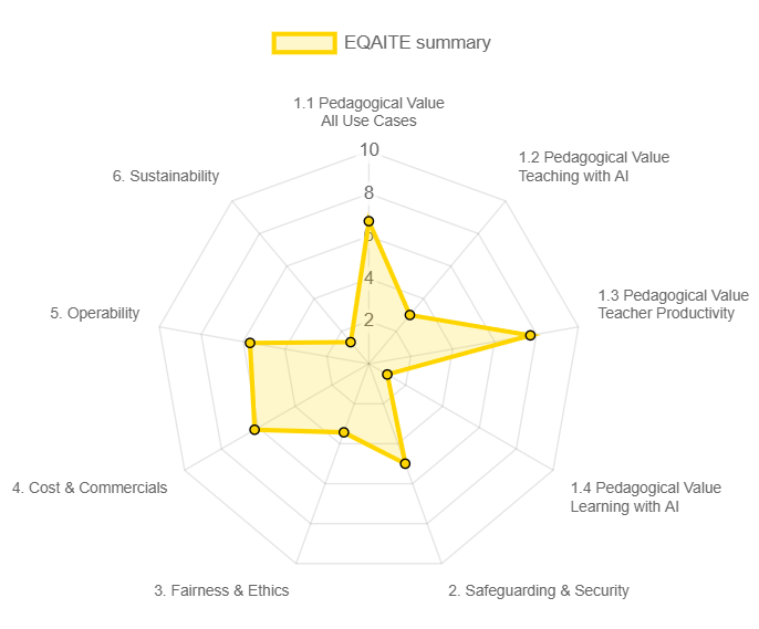 An AI tool, feature or affordance is evaluated against the framework, which produces a “radar map” summary of its strengths and weaknesses. This can be used to inform product choice, implementation strategy, staff training requirements and budgeting. In creating the framework, we have synthesised current research around AI in education, and you can see the sources we used in the appendix. Finally, the project team offer training and support to schools around AI adoption, you will find details on the project website eqaite.org.